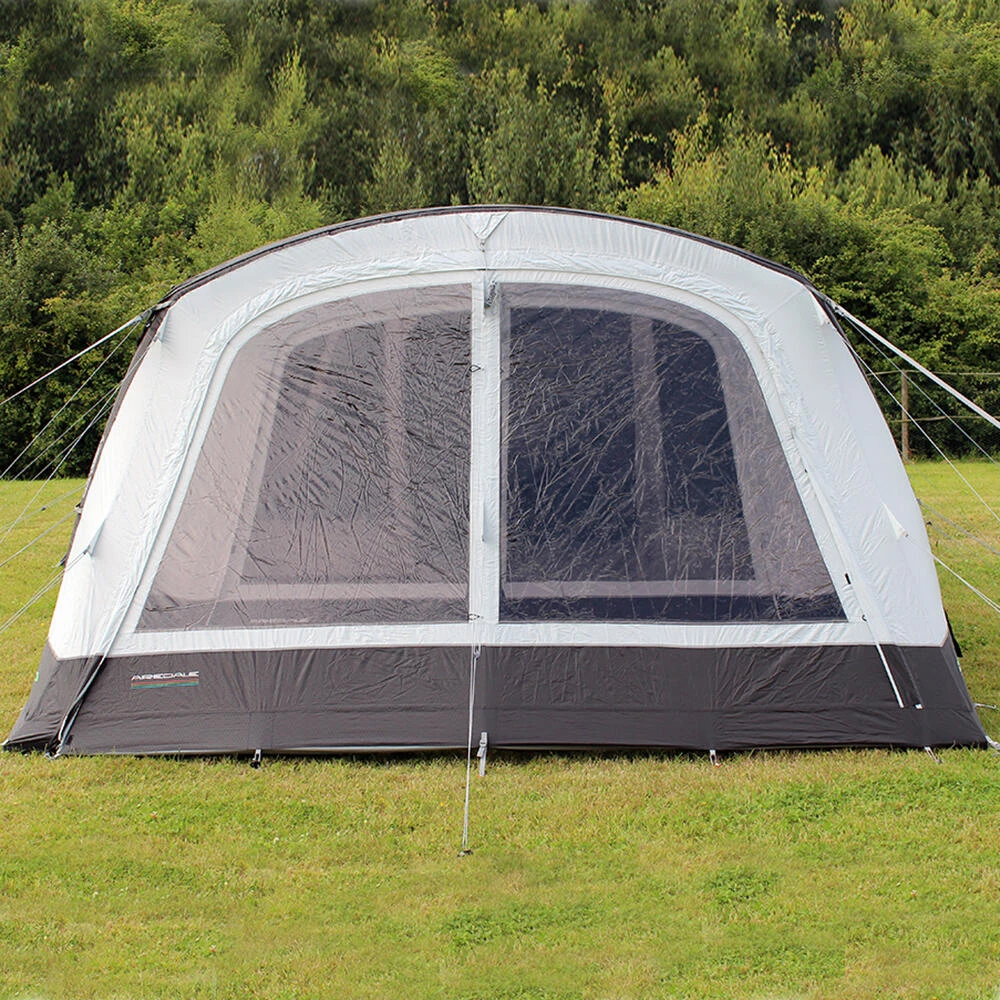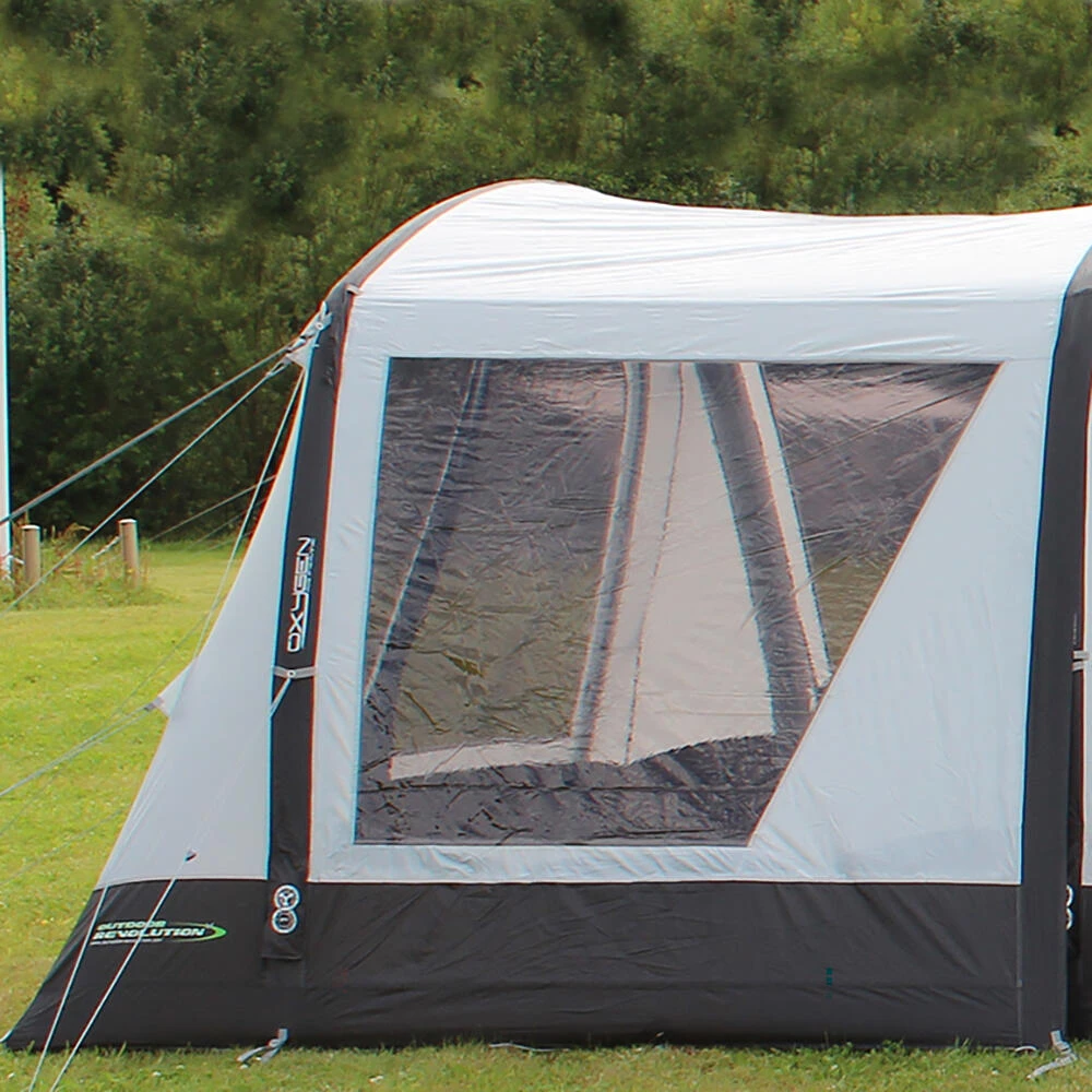 The fully enclosable Airedale Front Porch Extension, zips directly onto the front of our larger Airedale models. There are two variations available to match specific tents, this particular model is designed to fit the Airedale 6.0S & Airedale 6.0SE. This extension considerably extends usable utility space from the integral front porch, and builds on the excellent vista of the outside world through an enclosed windowed multi-position front door panel. It can be effortlessly pitched using our oxygen air frame system, comprising a single point inflation high-pressure air tube, the famed dynamic speed valve and an exclusive pressure relief valve. A ‘bath-tub’ toggle-in groundsheet is included as well as a bag of steel ground pegs, high visibility guylines, and fixings to attach storm straps. Please note this is NOT compatible with 2019 & 2020 Airedale models. • 240 HDE high density all-weather lightweight fabric